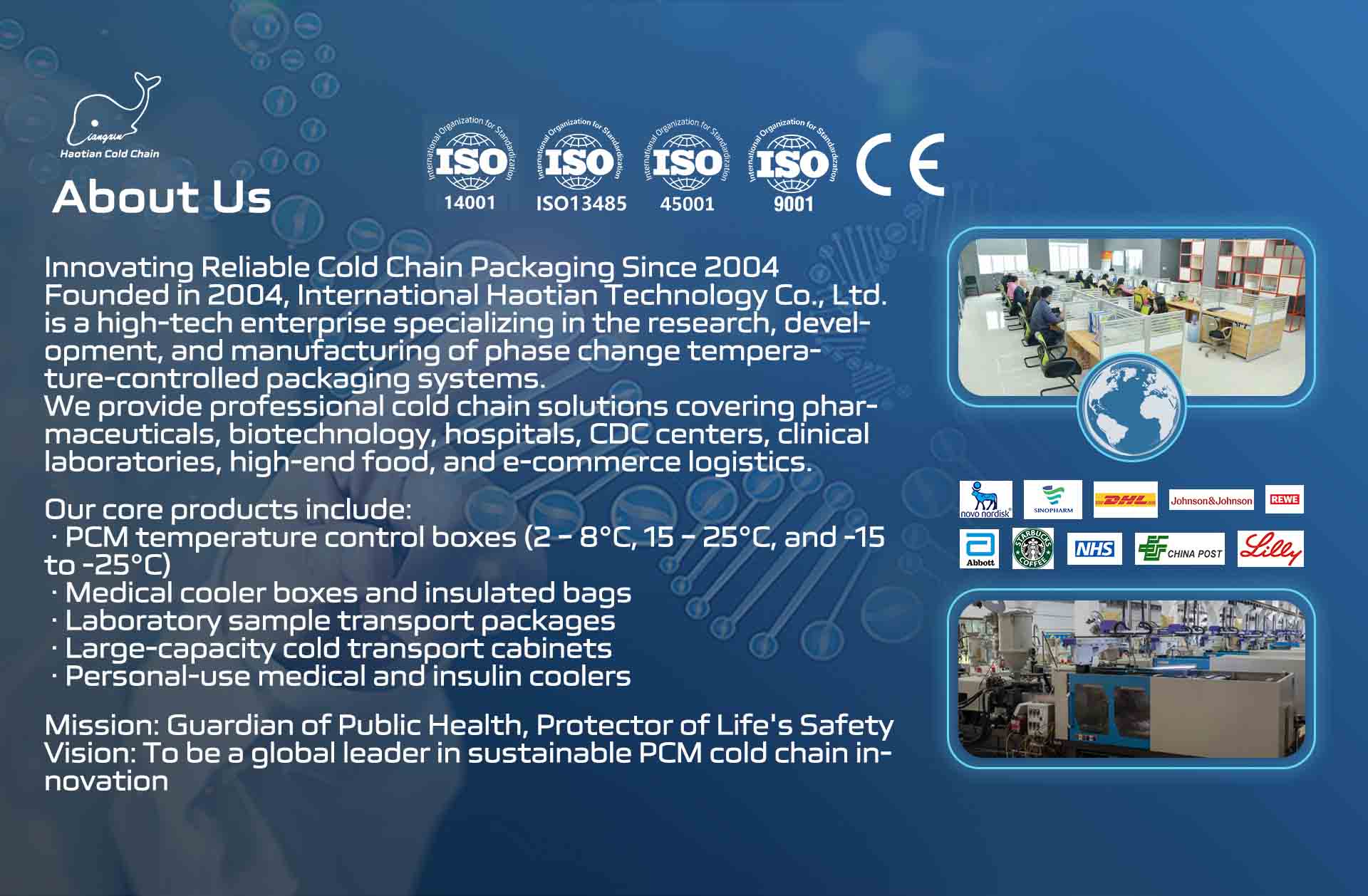 INTERNATIONAL HAOTIAN TECHNOLOGY CO., LTD is a dynamic High-new-tech Enterprise established in 2004 in beautiful seaside city Xiamen, China,focus on offering complete passive cold chain solutions- from design, test, to manufacturing - for the transport of products at safe temperatures for the medical and food industries, and in scientific applications. Our main products range from high quality passive cold chain package to PCM ice brick. for drugs, vaccine, biological agents, insulin, blood and other temperature-sensitive products, Our cold chain solution including chill, frozen and controlled room temperature. In addition, our lab provides customized configuration and testing services, new package solutions, and validation services to meet all regulatory requirements.
