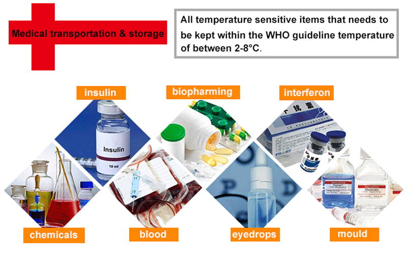 Cold Chain Bags and Boxes, specially designed to hold temperatures within essential safe temperature limits without electricity during transport or use for: