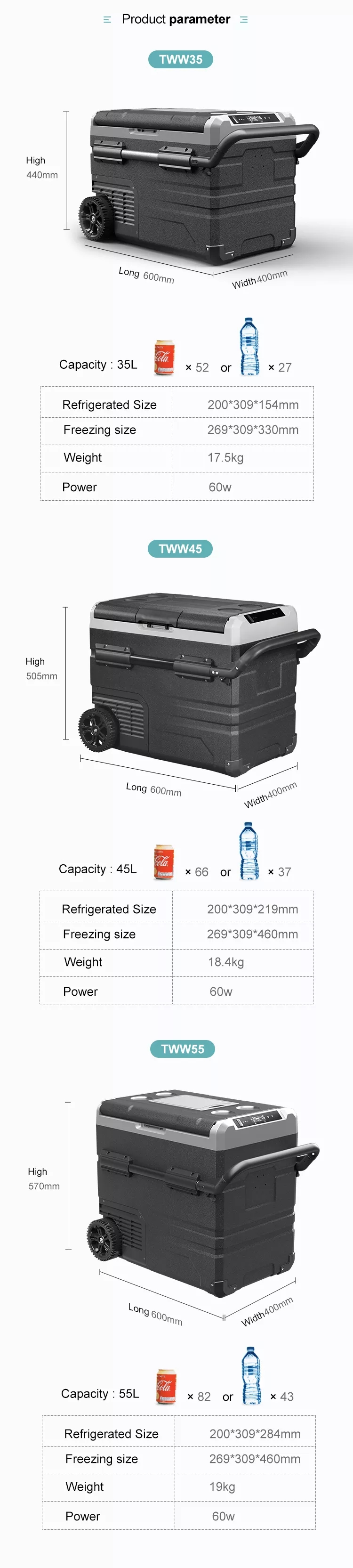 1.DC compressor refrigerator, AC to DC adaptor included.